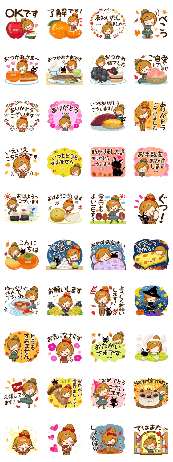 | スタンプ説明 | カラフルでおいしい秋の食べ物がいっぱい♡季節を感じるカスタムスタンプです♪敬語スタンプが多めで便利♪ (☆注意/こちらは発売したスタンプのカスタム再編集版です) |