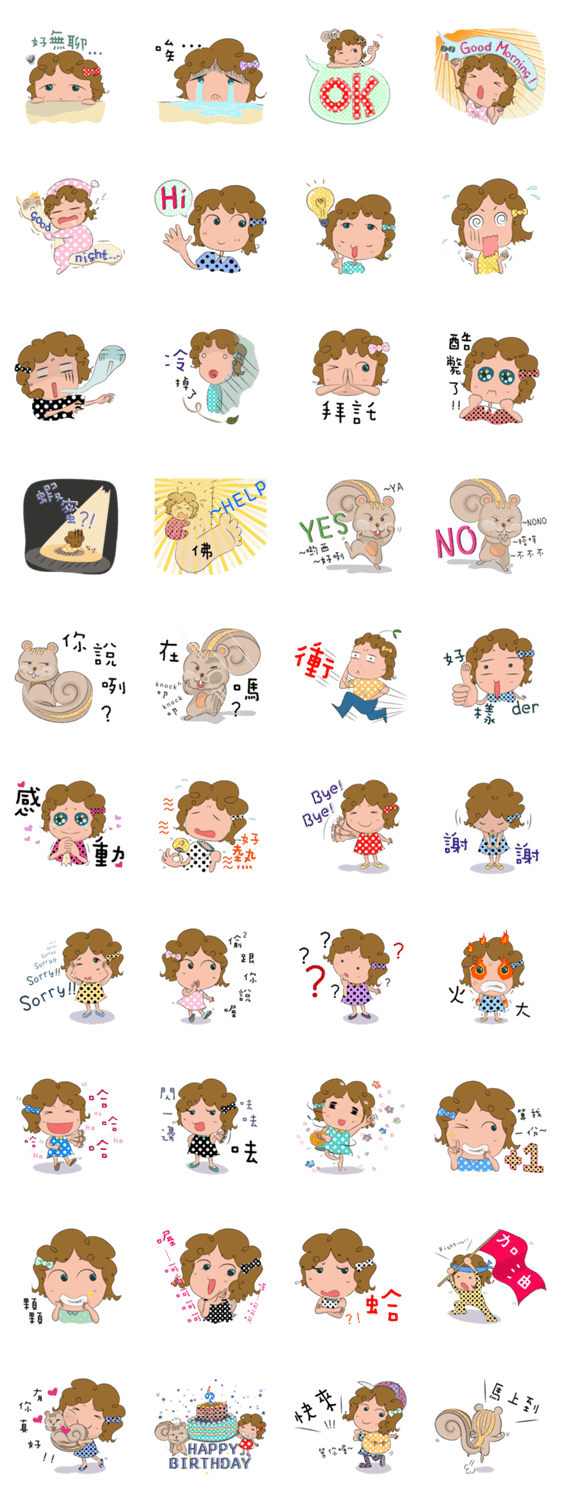 | スタンプ説明 | Miss Bean have curly hair and wear polka dot clothes, likes all circular things. Pet squirrel Coffeer likes cake. Miss Bean with Coffeer are first time debut !! |