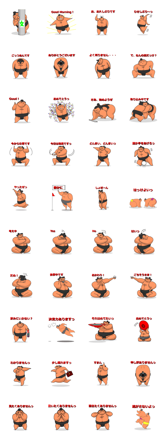 | スタンプ説明 | 日本の伝統文化の象徴である力士がスタンプに登場しました。可愛い力士たちのスタンプをご利用ください。 |