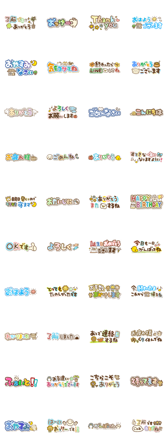 絵文字付きの可愛いカラフル文字メッセージ。省スペースで場所を取らないのでトークの邪魔になりません。毎日使える挨拶や日常会話です。