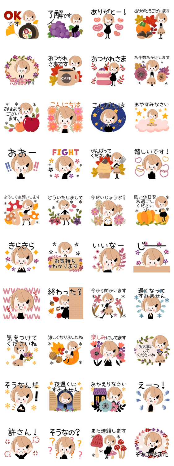 毎日使える可愛い秋色のガーリースタンプです。 あいさつ/おはよう/おつかれさま/よろしく/ありがとう