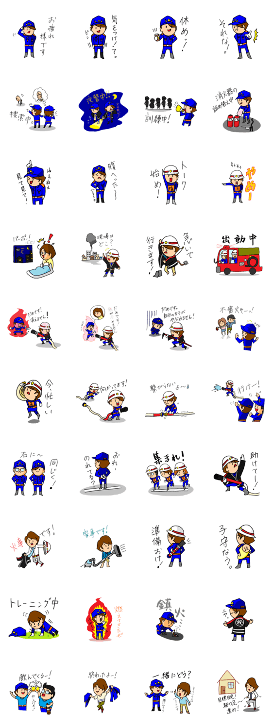 | スタンプ説明 | 地域のために日夜活躍している消防団員のみなさん!お疲れ様です!皆様へ応援の気持ちを込めて、訓練中、夜警中、出動中など使い勝手のよいスタンプを用意しました! |