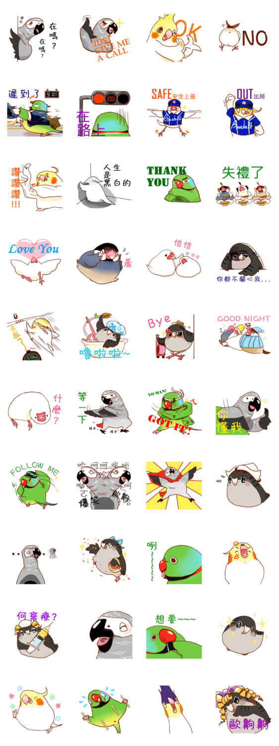 | スタンプ説明 | Use these stickers, and enjoy your nice days with pretty birds! Characters: Cockatiel, Rose-ringed Parakeet, Barred Parakeet, African Grey Parrot, Java Sparrow |
