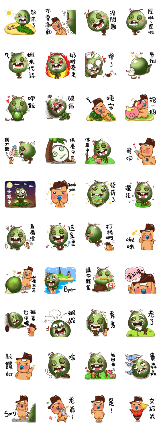 | スタンプ説明 | A Mai picked the coconut up, said "Oh my..., wu gau mai!(which means UGLY in Taiwanese)" Since then, Wu Gau Mai decided to fine A Mai. |