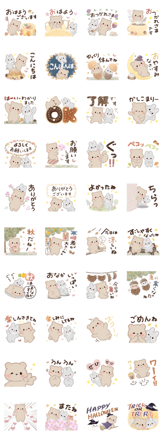 毎日便利に使えるチーくま秋のスタンプです・あいさつ・ハロウィン・うさぎ・シンプル