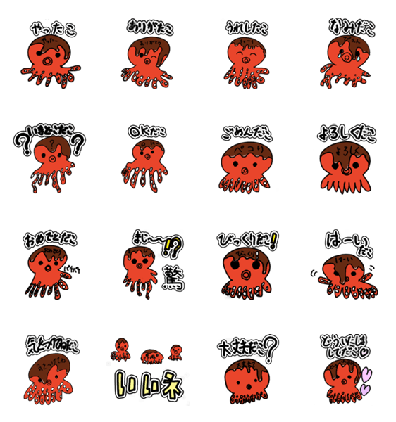 女子小学生が作ったスタンプ第3弾。チョコレートがかかったタコのオリジナルキャラクタースタンプです。文字を大きくしてお年寄りにも見やすくなるように心がけました。