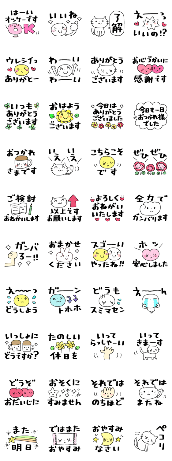 文字大きめ、シンプルでサクッと送れる便利な40個。ゆるくかわいいみんなで使えるスタンプです。気持ちが伝わるほっこりやさしい簡易シリーズ、心をこめて贈ります。