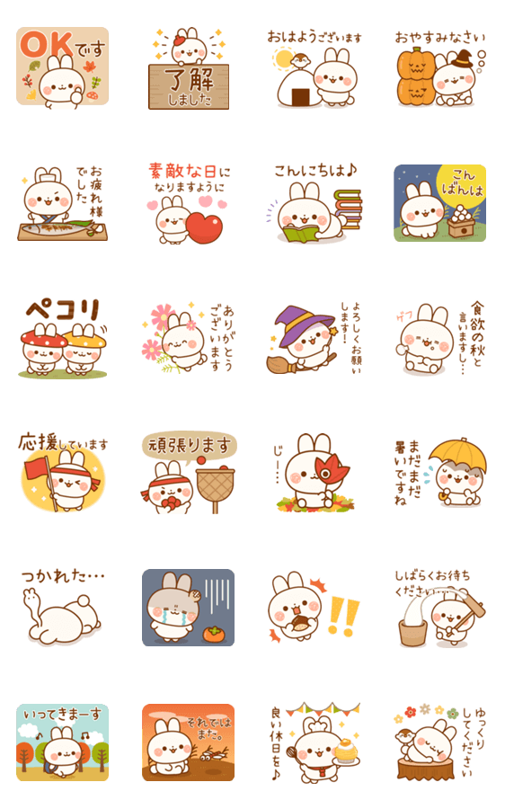 友達や家族、上司や仕事仲間にも使える♪可愛いウサギさんの秋要素たっぷりの使いやすい敬語スタンプです! (ハロウィン/お月見/運動会/紅葉)