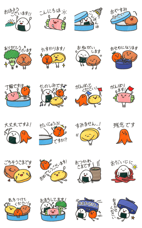 お弁当さんの仲間たち。おにぎり、卵焼き、からあげ、アスパラの肉巻き、ミニトマト、ブロッコリー、タコウィンナー!敬語中心の丁寧な言葉遣いで使いやすいスタンプです。