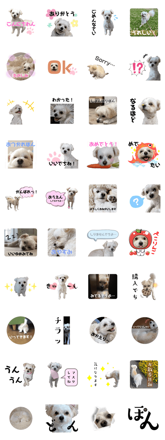表情豊かなチワワ×マルチーズのミックス犬、ぽんちゃんのスタンプです。日常の可愛い写真をスタンプにしました。背中とお耳のコゲ色がチャームポイント。