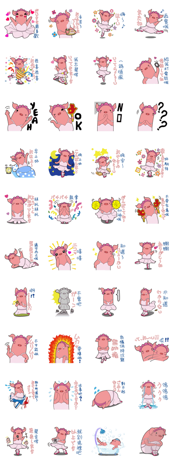 | スタンプ説明 | バレエの衣装が普段着の“バレブタ・リーナ”が日常会話を「日本語」と「中国語(繁体字)」で伝えるよ♪相互翻訳なのでコミュニケーションがとりやすいスタンプです。 |