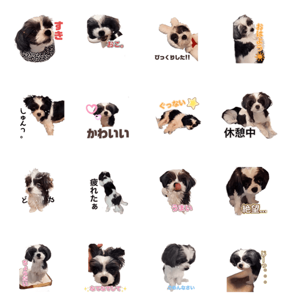 可愛いモノクロの愛犬の日常スタンプを気持ちを込めて作りました。皆さん是非使ってみてください!!