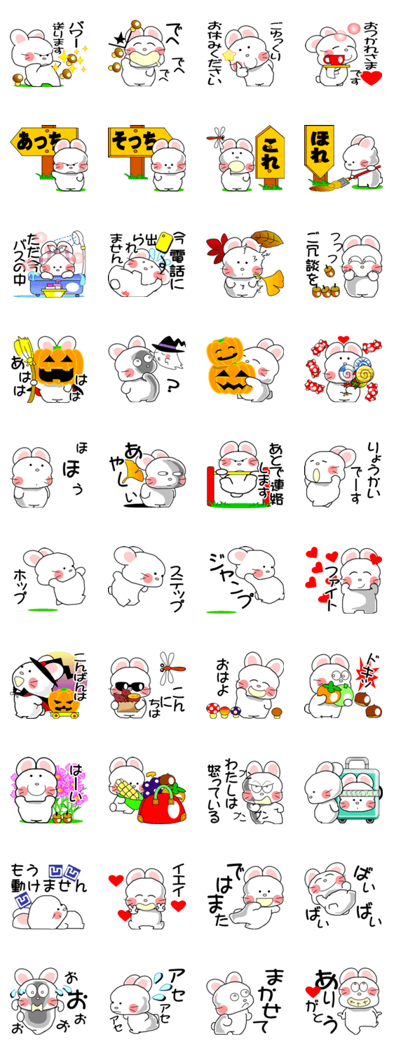 白くてふわふわモコモコなおはうさ番外編の3つ目は 美味しい秋のスタンプです。ハロウィンもあるよん。