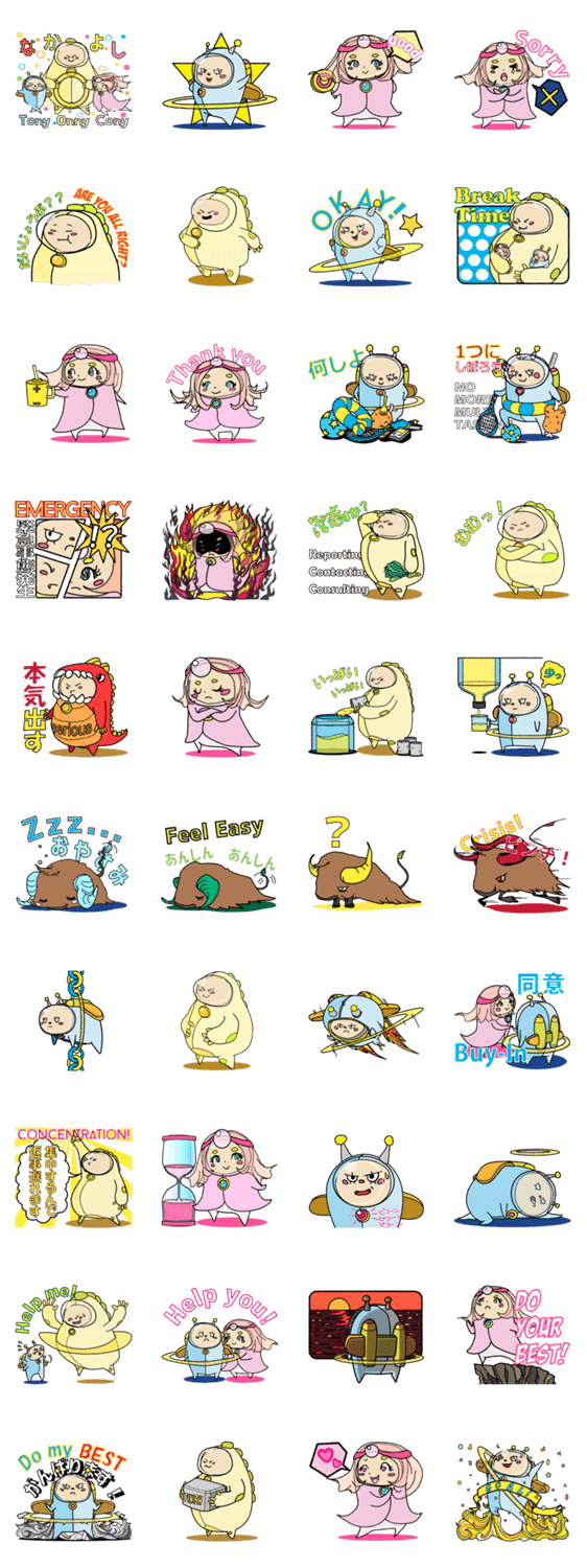 | スタンプ説明 | 「TOC'n」(トックン)はトニー・オニー・コニーのなかよし3兄妹。サポートロボットのバッファ郎と彼らのスタンプがあなたの気持ちを代弁!きっといい仕事しますよ! |