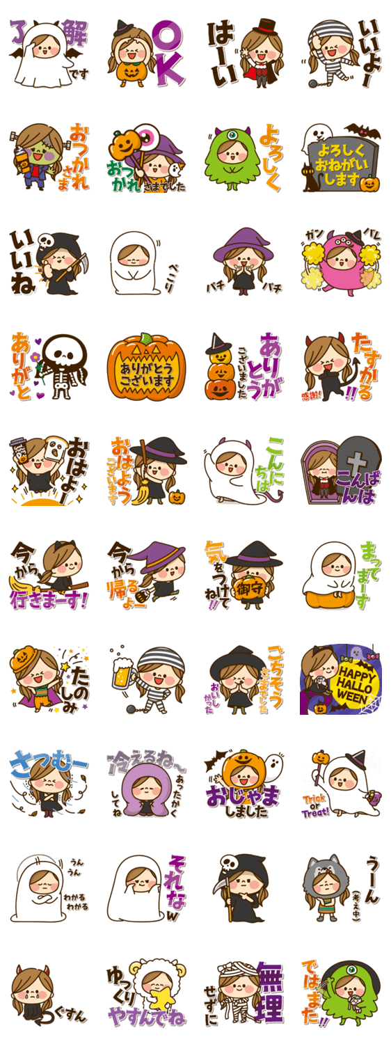かわいい主婦の1日第65弾【ハロウィン編2】はかわいい女の子の楽しいハロウィンスタンプです。魔女・黒猫・おばけなど色んな仮装のかわ主婦がハロウィンを盛り上げます!