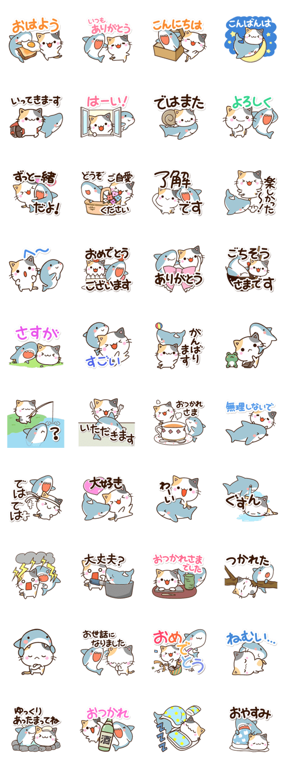 三毛猫の『ちびミケ』と、かわいい鮫キャラの『ちびサメ』。可愛く、ペアで返事ができます。毎日よく使う言葉や、あいさつ等の、ずっと使える、さめと猫のスタンプです。