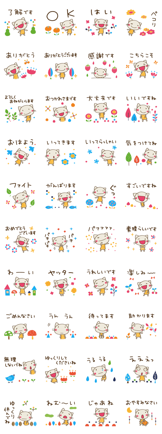 | スタンプ説明 | どちネコ。北欧風。「了解です」「いってきます」から「わーい」まで。明るい色合いで、毎日挨拶にぴったりなシンプルメッセージがいっぱい。家族、学校、お仕事でも。 |