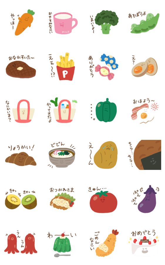 ゆる〜いお顔がついた食べ物たち。 日常会話を楽しく面白くサポートしてくれます! カジュアルな文字なのでお友達や家族にも使えます♪