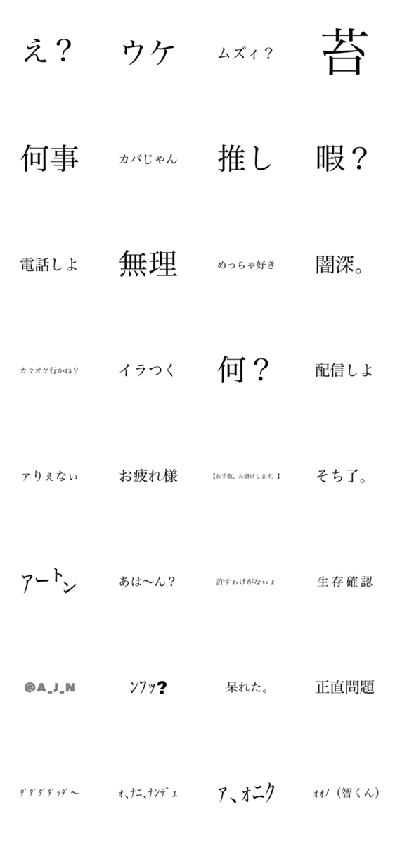 | スタンプ説明 | とある人が使う言葉、推しのイニシャル等のスタンプです。使えそうで実は使えない。使えなさそうで実は使える。そんなスタンプです。 |