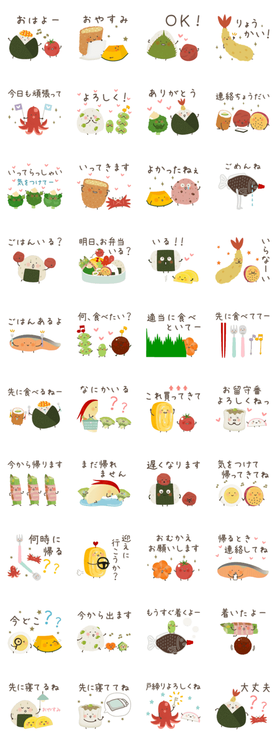 ゆるいお弁当のなかまたちの家族・カップルの日常で使える連絡スタンプです。つぶらな瞳であなたを見守ります♪