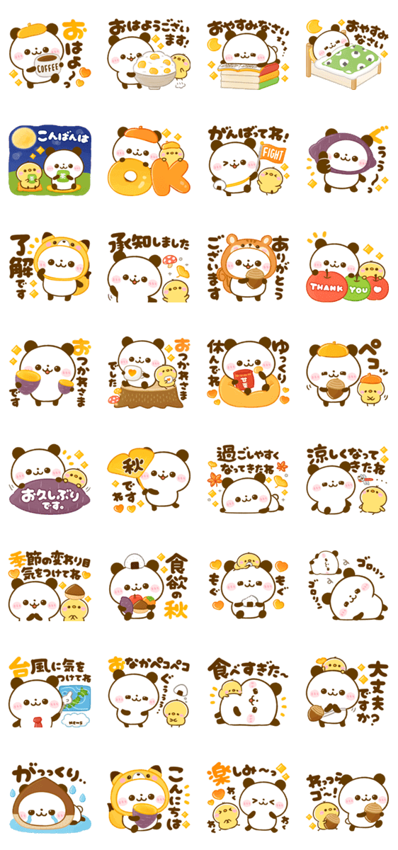 トーク画面を秋らしく彩るころころパンダのスタンプです。