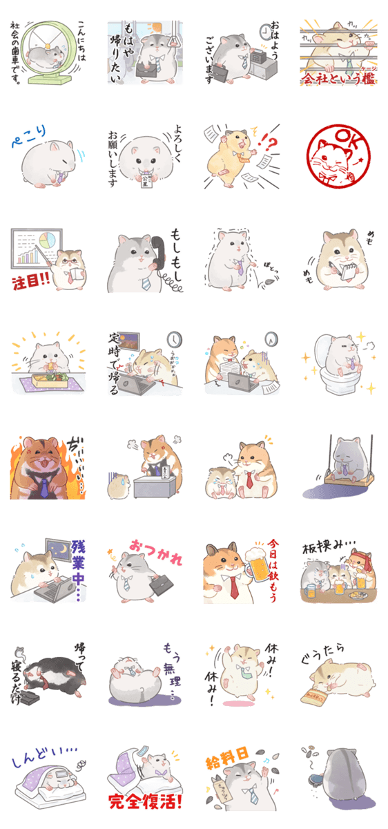 頑張って働くハムスターたちの少し世知辛いスタンプです。