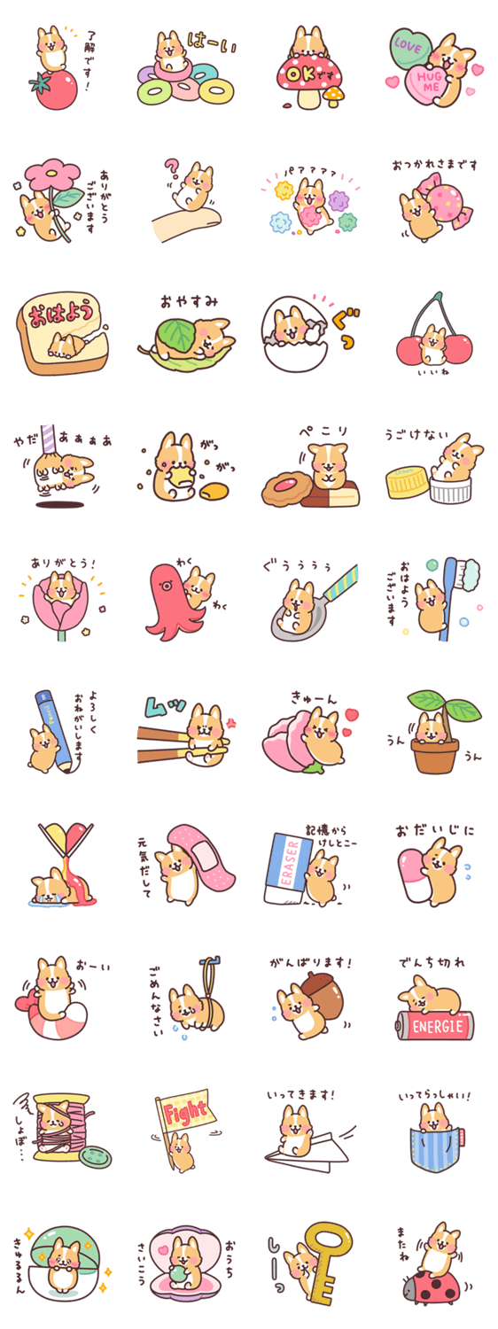 まるまるコーギーが極小サイズになっちゃった!どんぐりを運んだりペットボトルのキャップにハマったり。とっても小さなコーギーのスタンプです。