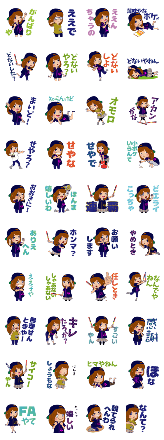 | スタンプ説明 | 推しの背番号「44」の応援女子。お友達へのやんわりツッコミ関西弁編。シチュエーションに合わせた「せや」「知らん」活用などなどプレゼントにどうぞ |