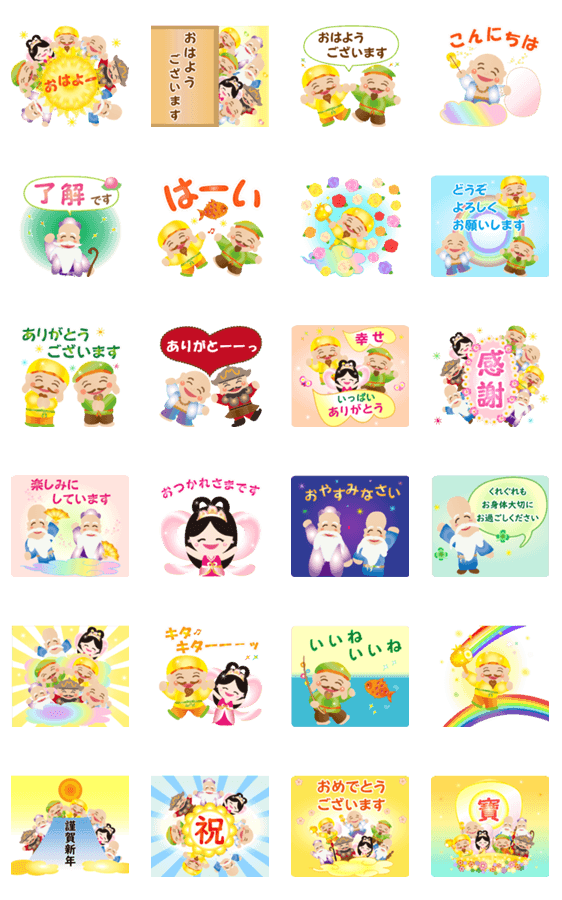 | スタンプ説明 | みんな誰かの福の神♪毎日使える挨拶を色や言葉のパワーとともに☆彡七福神シリーズのポップアップスタンプです。 |