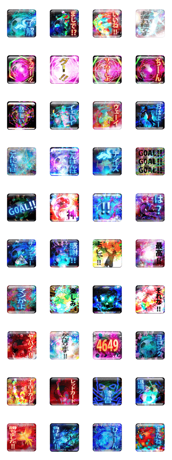 | スタンプ説明 | 燃え上がるサッカーボールに宇宙などアート風に!!龍、鳳凰、ドクロ、梵字など唯一無二のクールなスタンプどうぞ!! |