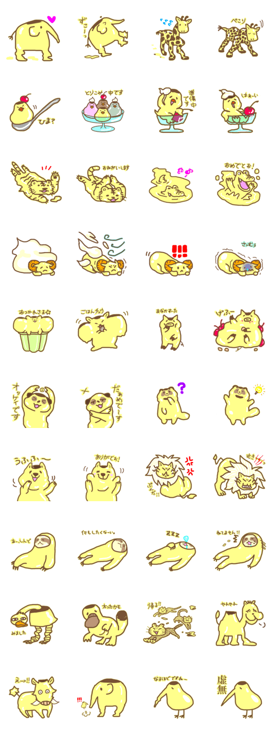 体がプリンでできた動物たちのスタンプです。ゾウ、キリン、ライオン、ハムスター、ぶた、ミーアキャット、イボイノシシ、ナマケモノ、ワニ、ダチョウ、キーウィなど。