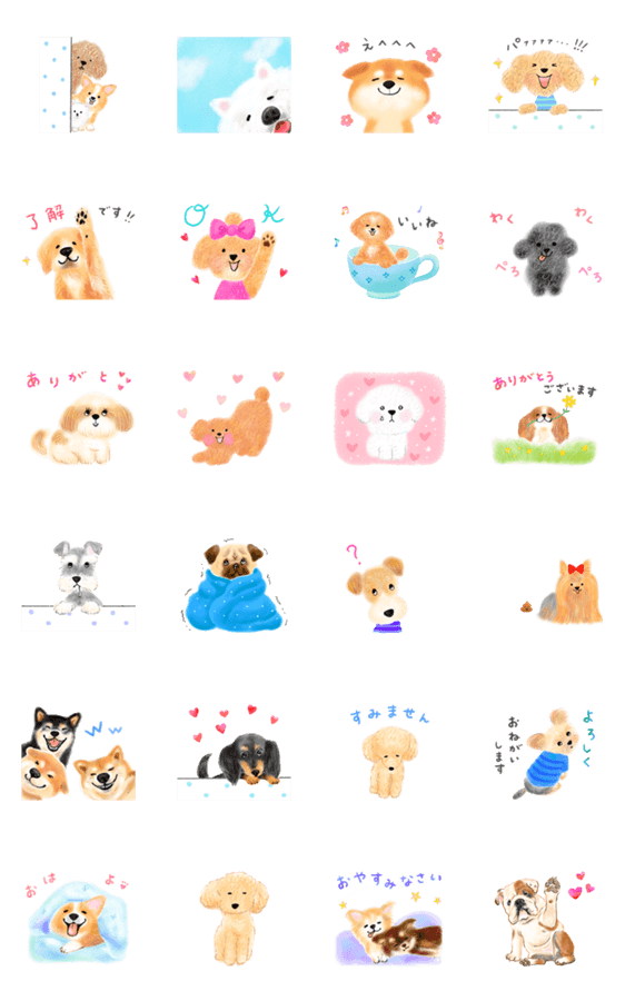 犬好きさん必見☆可愛く動く!ワンコ達の毎日使えるスタンプです♪トイプードル、柴犬、パグ、シーズー、ダックス、シュナウザー、ヨークシャーテリア、コーギーなどなど♡