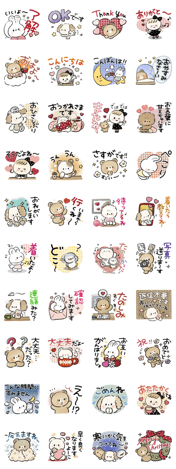 大人の思いやり、優しさ溢れる冬色スタンプです♩ くま、うさぎ、ペンギン、いぬ、ねこ、女の子、クリスマス