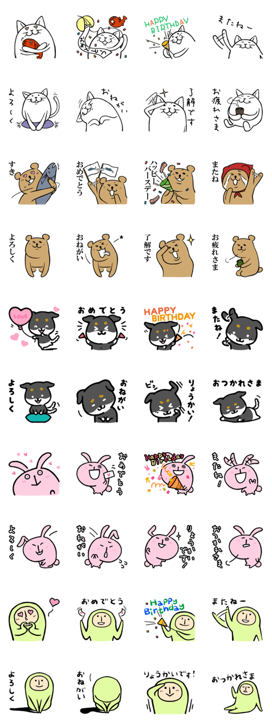 日頃良く使うスタンプが5キャラパックになって登場!1つのスタンプで5キャラ分のバリエーションが使えてお得!?キャラは、ネコ・クマ・イヌ・ウサギ・人型の5キャラ。