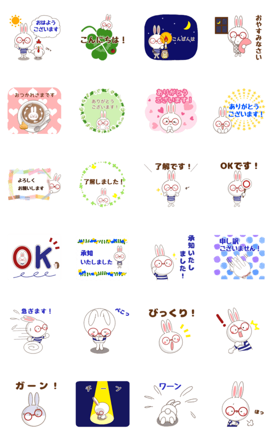毎日使えるシンプルなスタンプです。メガネをかけたうさぎの女の子が丁寧語とリアクションでかわいく返信してくれます。