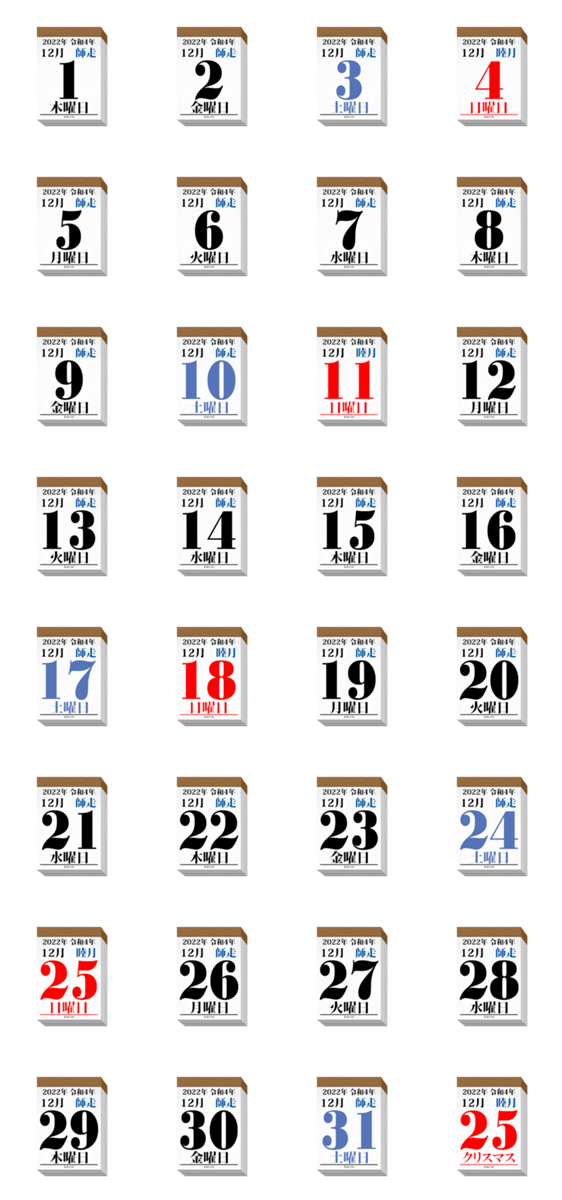 日本対応の暦のステッカーを作りました。2022年12月のセットです。