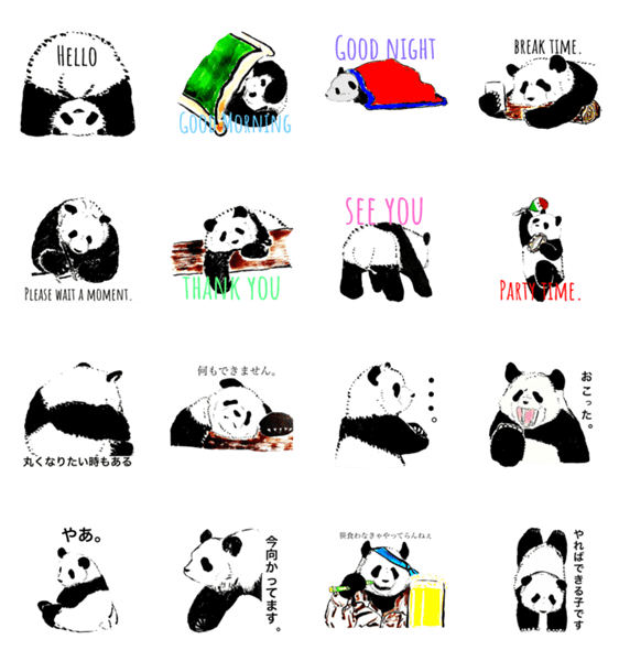 社会でがんばる皆さんに元気になってもらいたい。そんな思いを持ってるようで何も考えてないパンダ達の日常を切り取ったスタンプです。