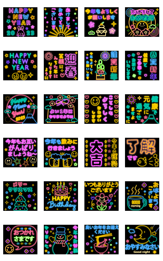 大人の丁寧な言葉遣い等、お正月の挨拶をネオンサインにしました。いつもとはちょっと違うピカピカ光るカラフルな年賀状!クリスマスや日常・年末の挨拶もあるよ♪2023年版