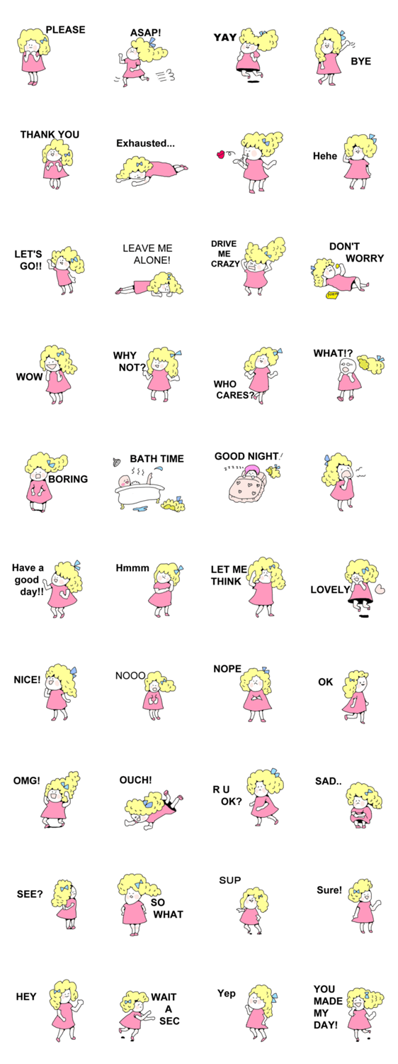 女の子のスタンプです。全て簡単な英語ですので、日常の様々な場面に使えます。