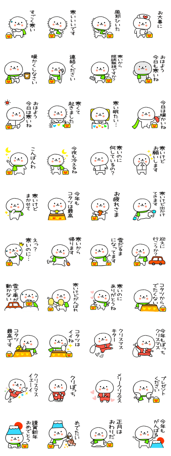 冬に毎日使える日常会話スタンプです。しろまるいキャラのあけおめスタンプ★クリスマス、正月ネタもあります。 もるきゅた作