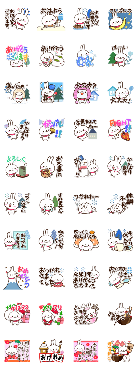 ちいさいウサギの、ずっと使える冬の行事スタンプ。よく使う言葉や、クリスマスから年末年始のあいさつまであるスタンプ。しろいうさぎキャラ好きな方にぜひ。【かたこ】