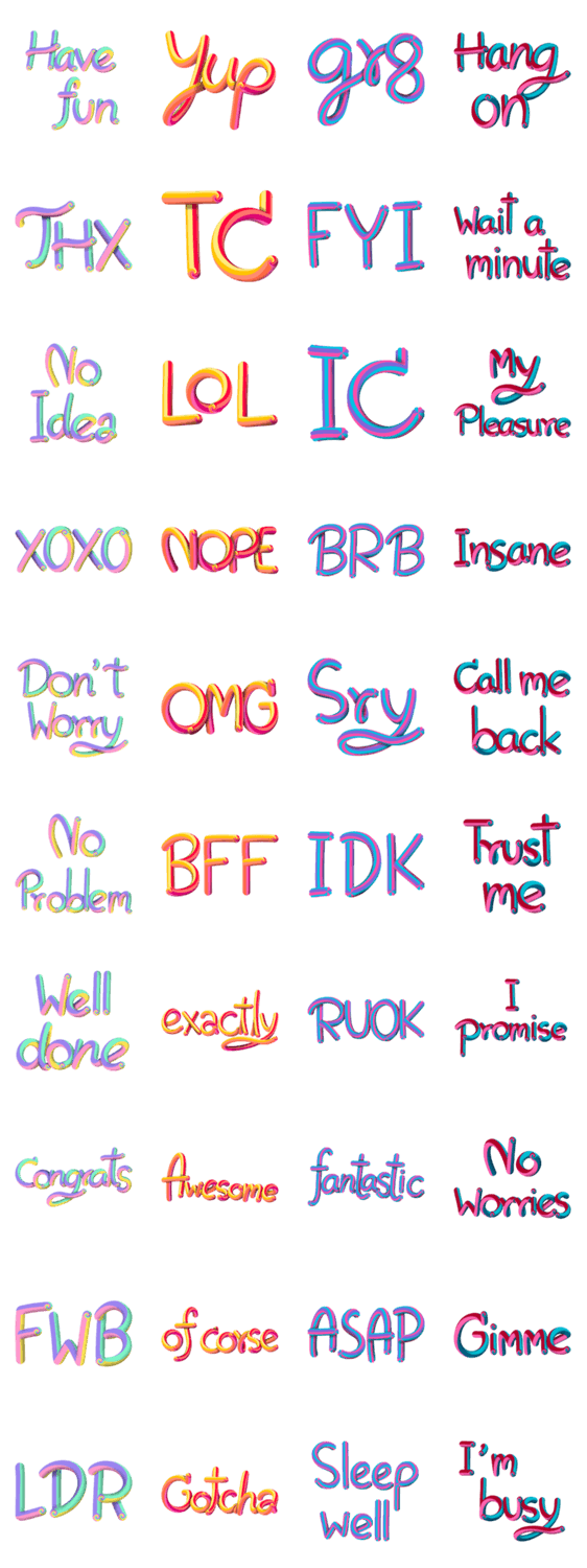 | スタンプ説明 | English words, abbreviation, short phrase for daily life for greeting, for wishes and for congratulation. Hope you like it. |