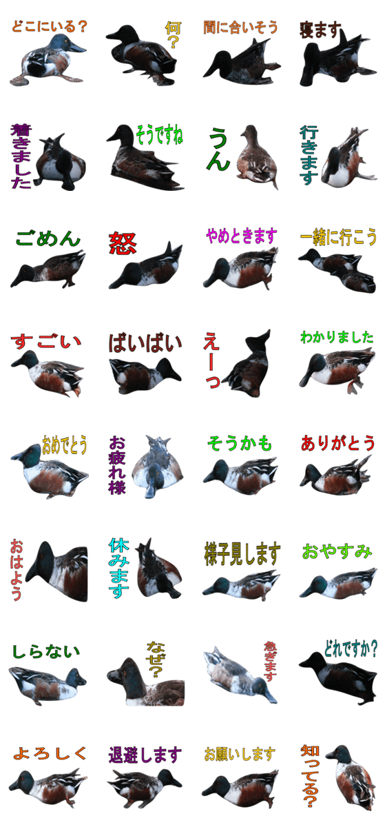 | スタンプ説明 | 水辺のハシビロガモの写真を使って日常系のスタンプを作りました。 |
