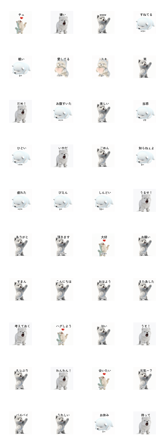 優しいかわいい白い北極毛桃のサモエード犬。 簡単な英語、中国語、タイ語、韓国語日常旅行の基礎会話学習。 ピンク色の赤いハート 愛、怒り、悲しみ、憎しみ 感情表現 9gK