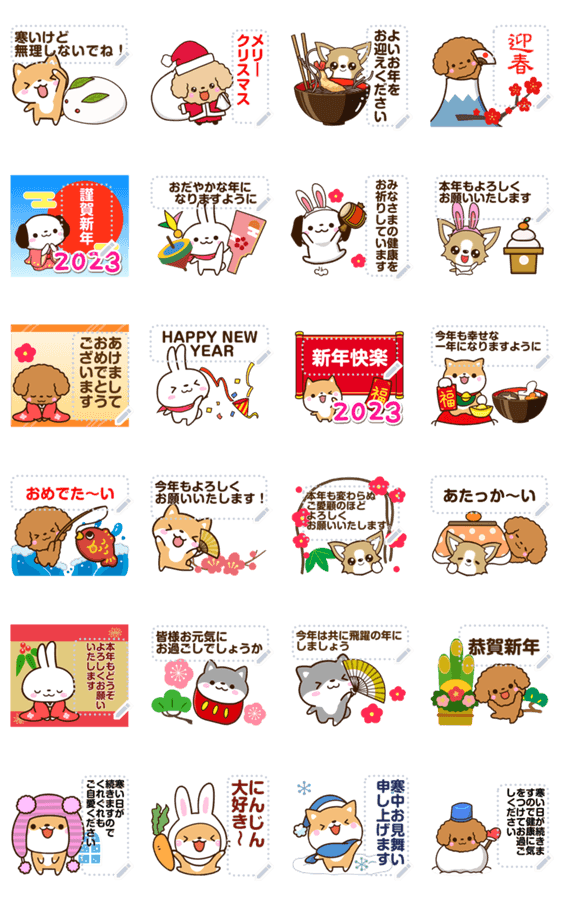 | スタンプ説明 | チワワやトイプードル、柴犬にうさぎ等の、冬のあいさつ、クリスマス、年末年始等の新年のあいさつにも使えるメッセージスタンプです。自由に文字を入れられます【かたこ】※2023/1/3(火)23:59までに購入すると特典「LINEおみくじ」がもらえます。 現在この商品は一部のスマートフォン版LINE 10.3.0以上のトークルームでのみ使用できます。動作環境の最新情報はヘルプをご確認ください。 |