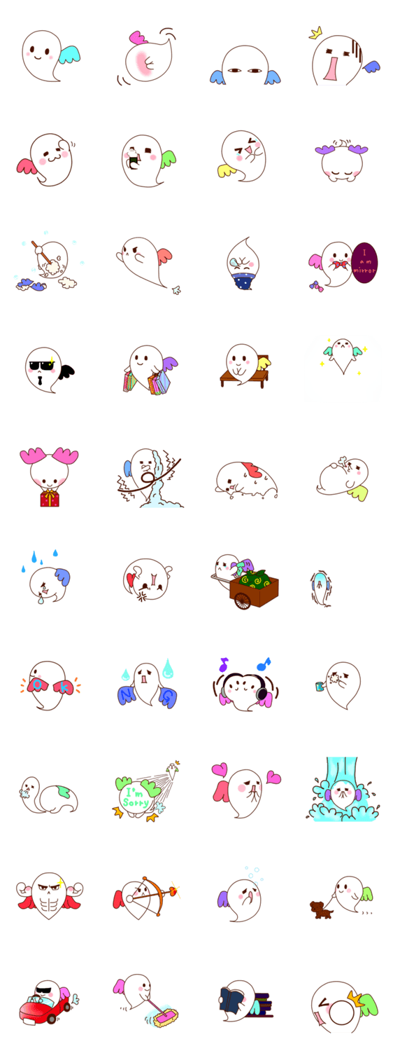 天使になりたいおばけさん。天使になる為に自作のハリボテ羽根で修行中です。コミカルで可愛い天使おばけのスタンプで楽しいやりとりを。