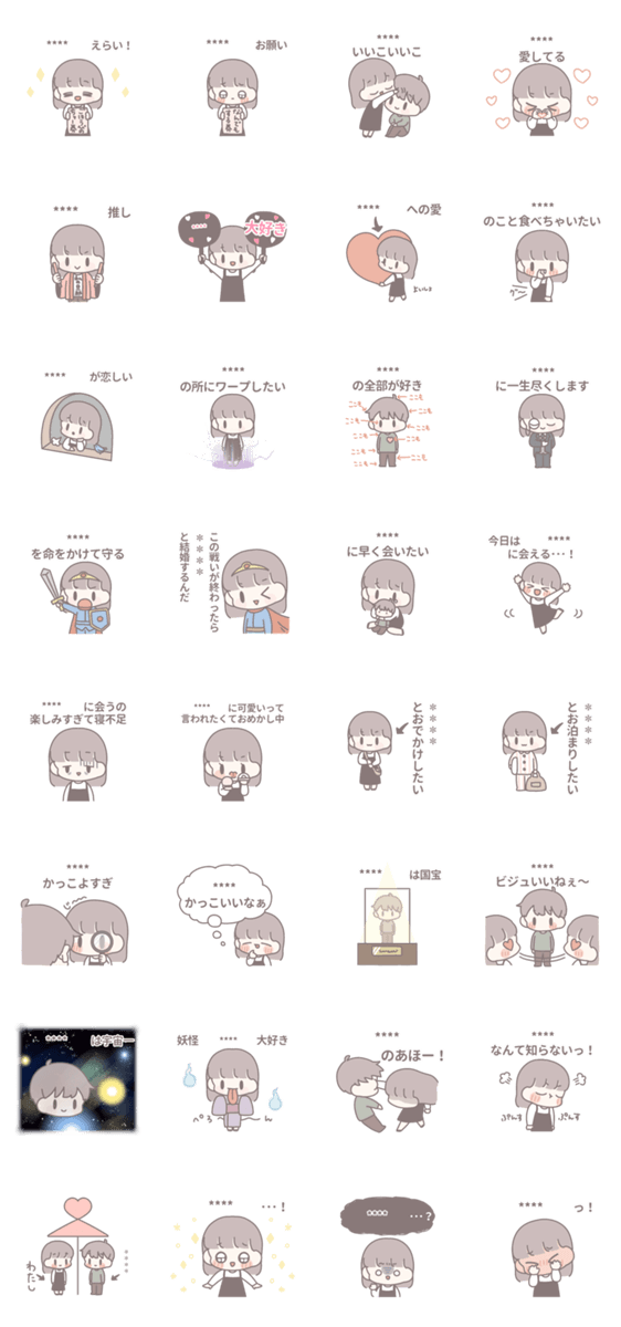 カップルや夫婦向けの、パートナーを愛でるスタンプです。関連用語:彼女/妻/女の子/夫婦/推し/同棲/溺愛/かわいい/恋人/好き/ラブラブ/カスタムスタンプ/名前