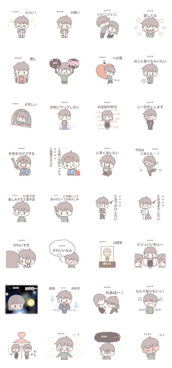 カップルや夫婦向けの、パートナーを愛でるスタンプです。関連用語:彼氏/夫/男の子/推し/推し活/同棲/溺愛/かわいい/恋人/好き/ラブラブ/カスタムスタンプ/名前