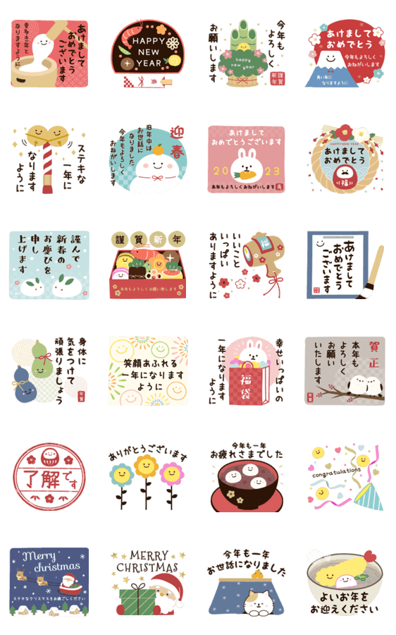 飛び出す!動く!お正月のポップアップスタンプです。クリスマス、年末年始、新年のご挨拶やお祝い等にお使い下さい。日常会話やうさぎ年に使えるスタンプも入ってます。※2023/1/3(火)23:59までに購入すると特典「LINEおみくじ」がもらえます。