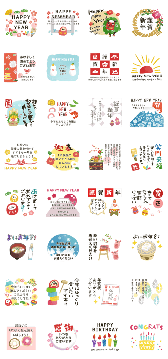 シンプルでキャラクターなし誰でも毎年使える年末年始スタンプです。動かない/あけおめ/おめでとう/敬語/